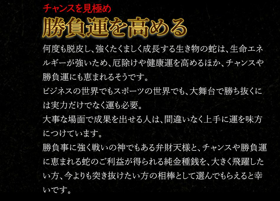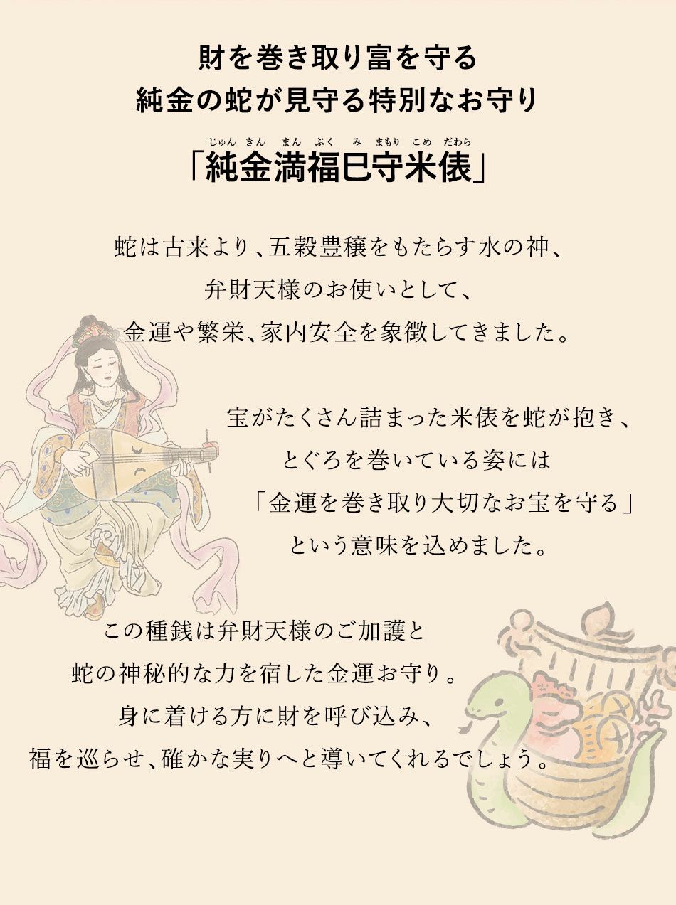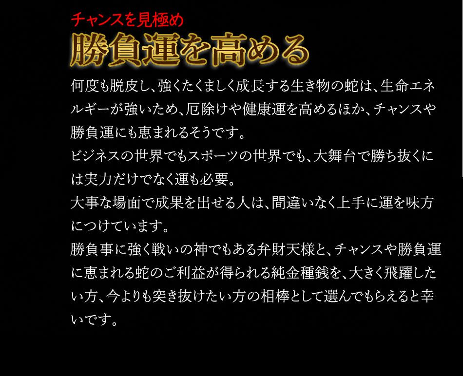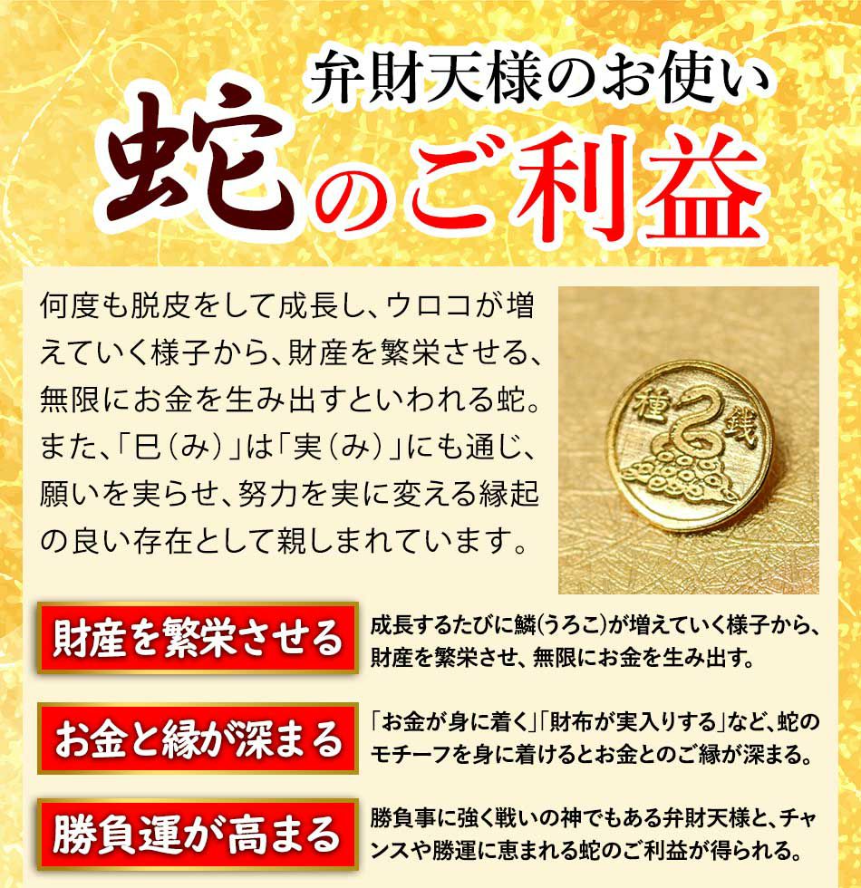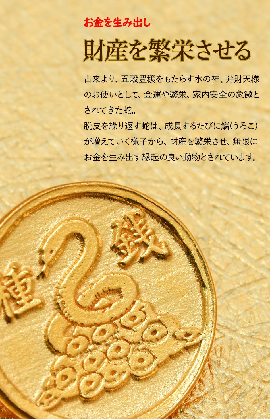 福財を授ける神、弁財天様のお使いである蛇をモチーフにした、金運アップの種銭です。