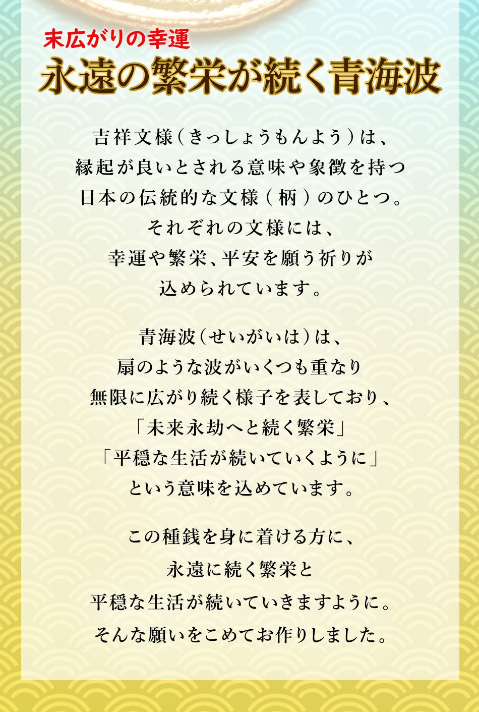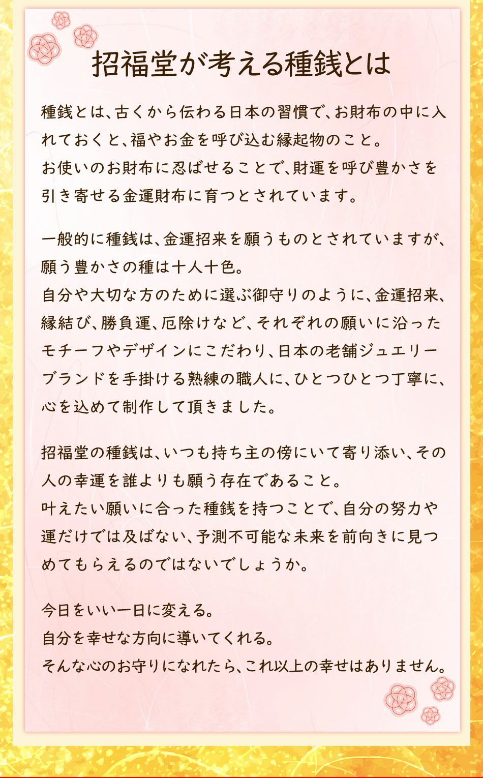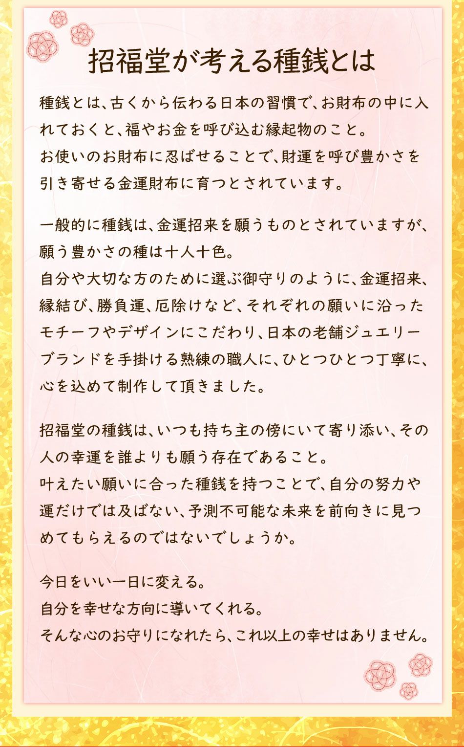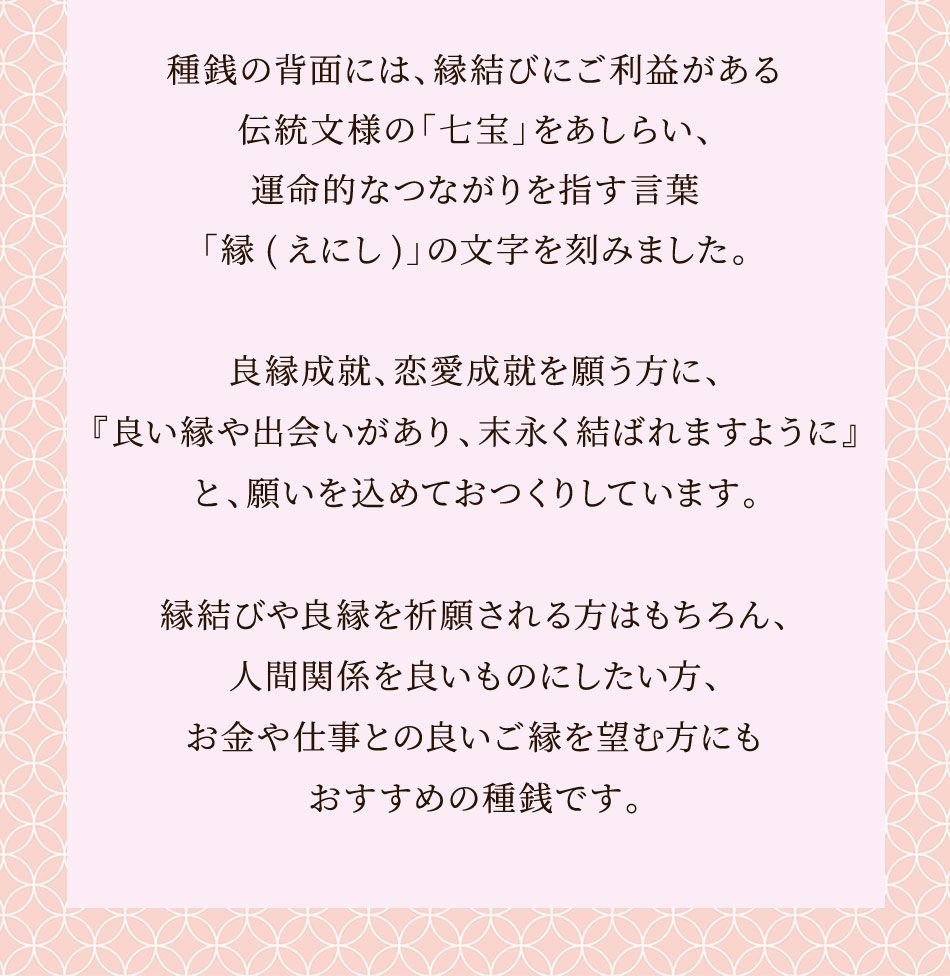永遠の繁栄を手にしたい方、円満な関係を築き豊かな人生を望む方におすすめの種銭です。