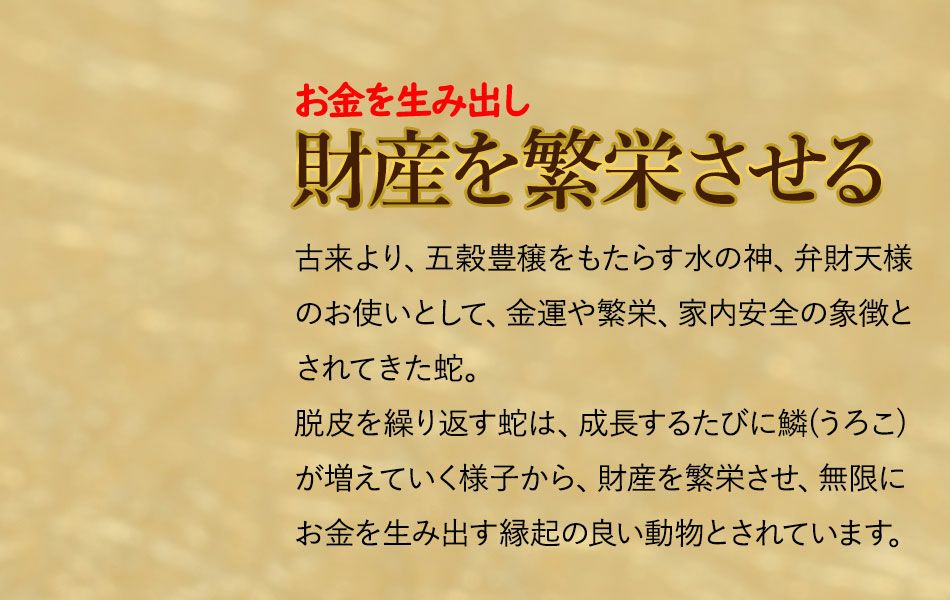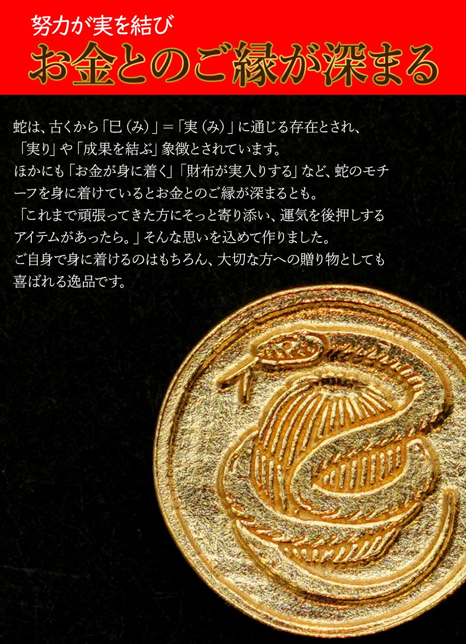 古銭に金運の循環を象徴するとぐろを巻く蛇が鎮座している姿は、「お金が尽きることなく未来永劫、豊かさに恵まれる」意味を込めました。