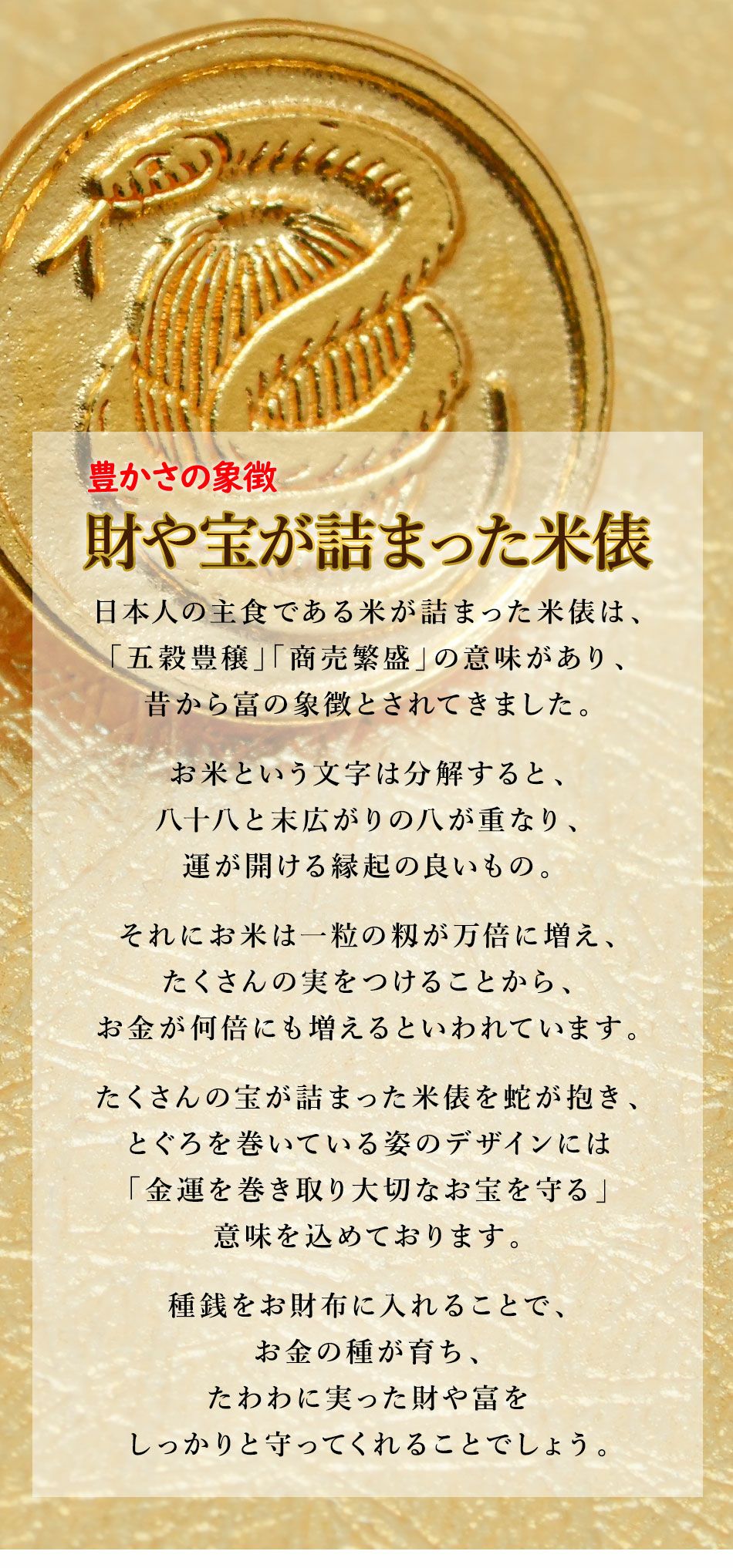 無限にお金を生み出すと言われる蛇と、富の象徴とされる米俵をモチーフにしてお作りした、お財布のお守り種銭です。