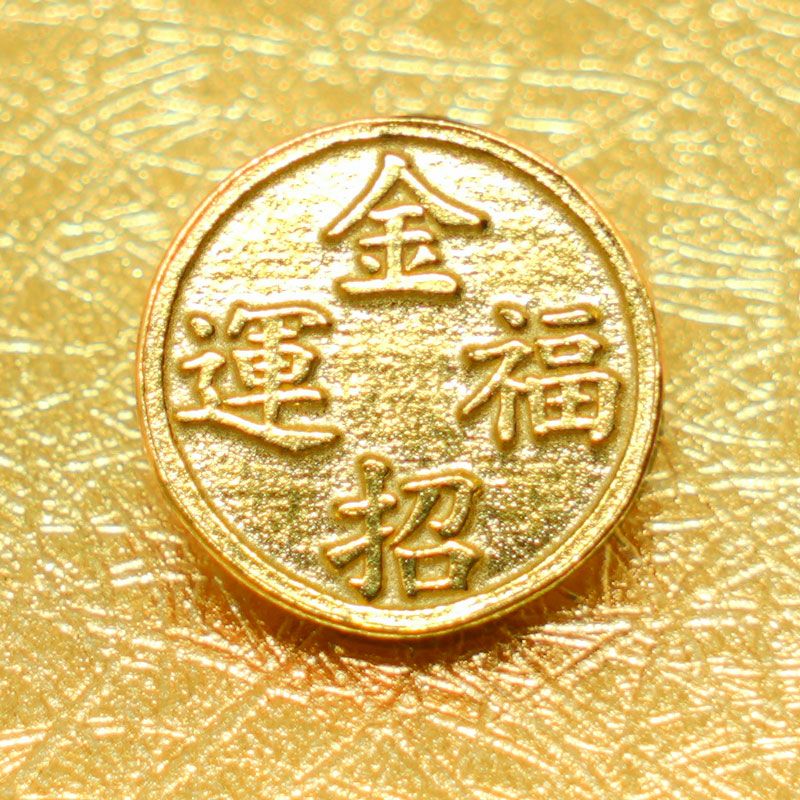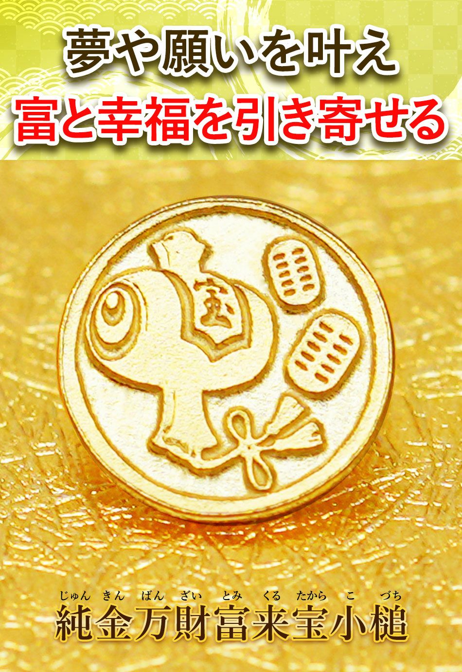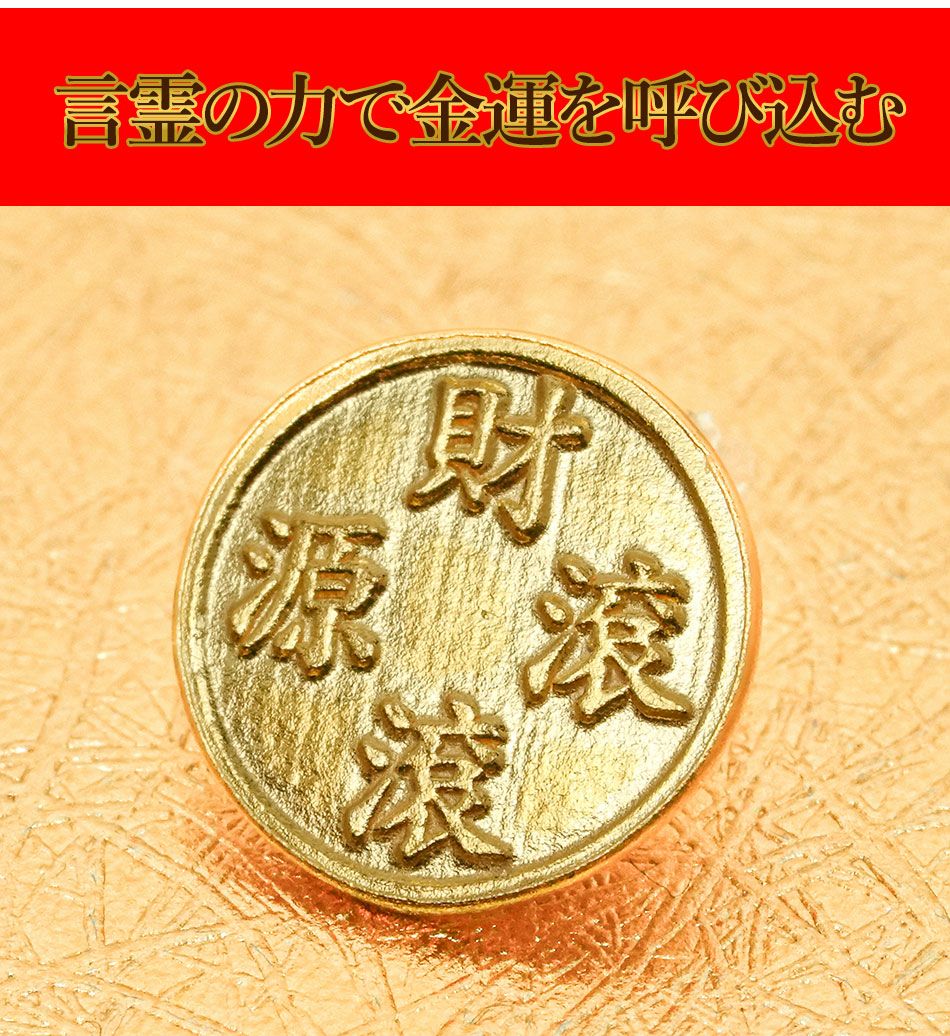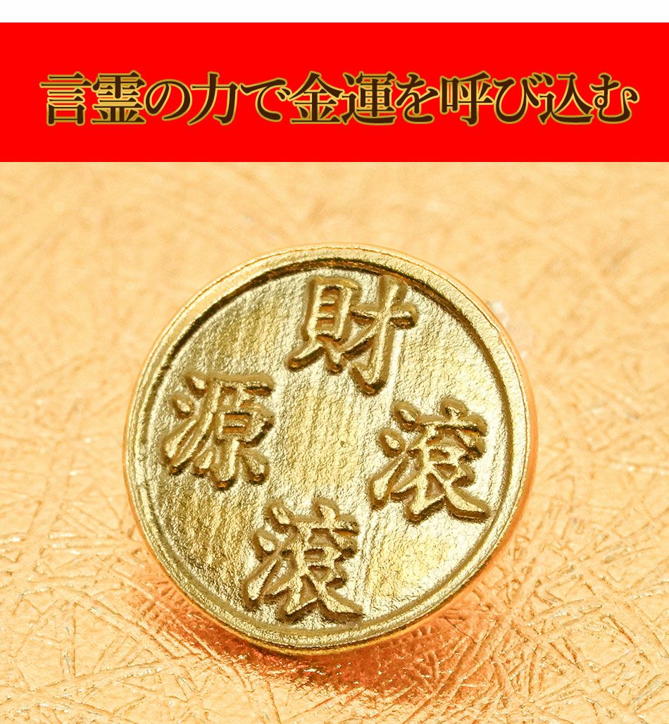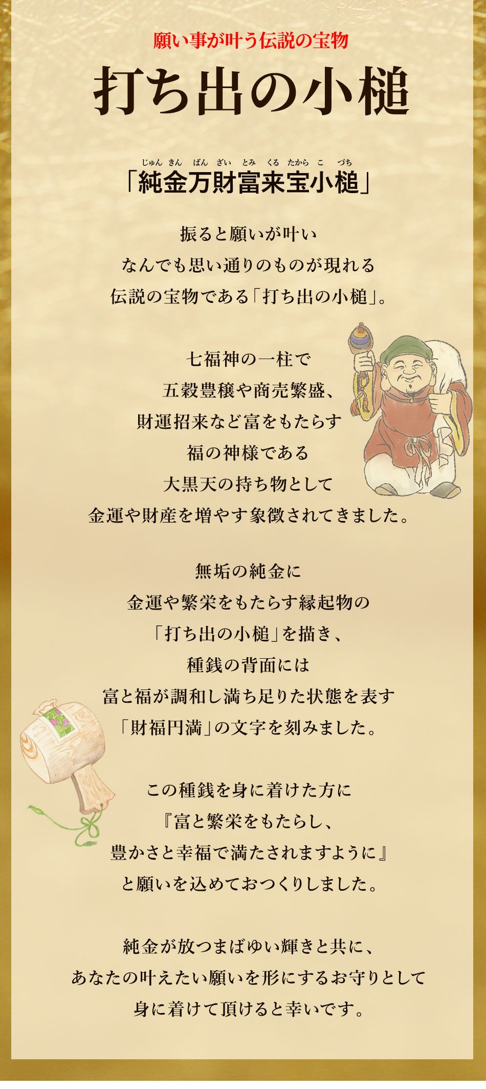 富や福を授ける神、大黒天様のの持ち物である打ち出の小槌をモチーフにした、金運アップの種銭です。 金運効果が高いといわれる純金に、どんな願いでも叶うとされる伝説の宝物の「打ち出の小槌」を描き、背面には富と福が調和し豊かな人生を願う「財福円満」の文字を刻んでいます。 永遠の豊かさを手にしたい方、円満な生活を望む方におすすめの種銭です。