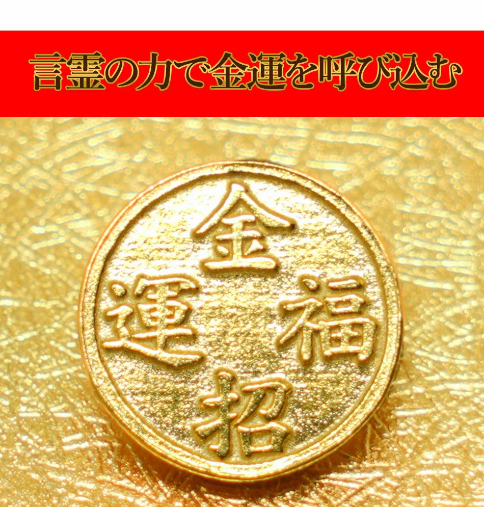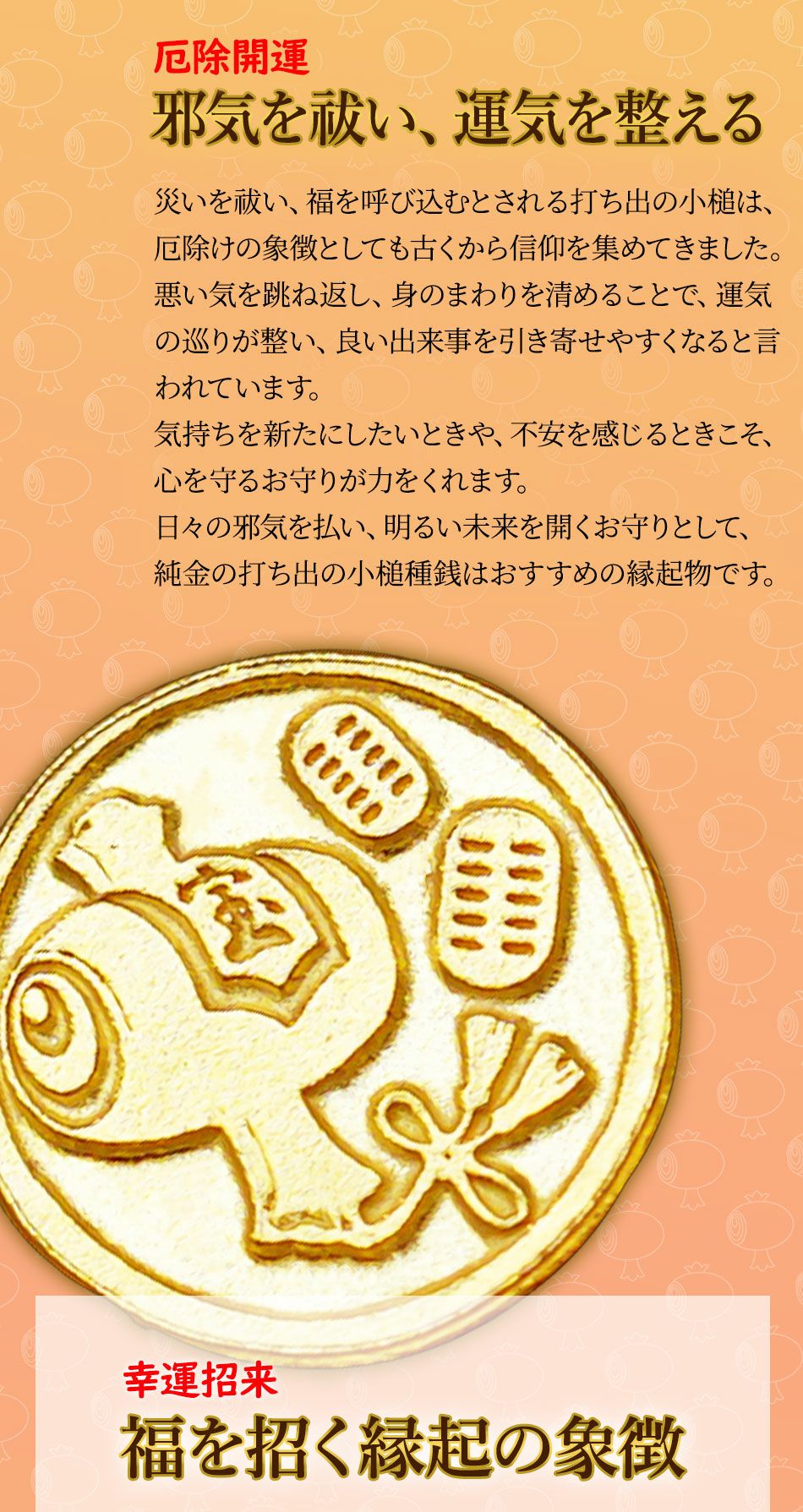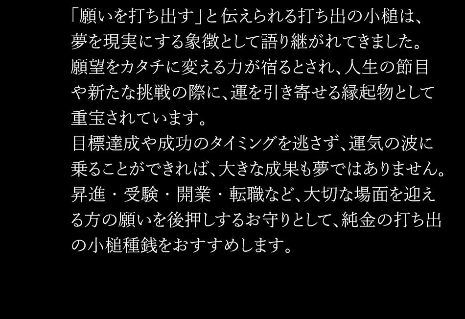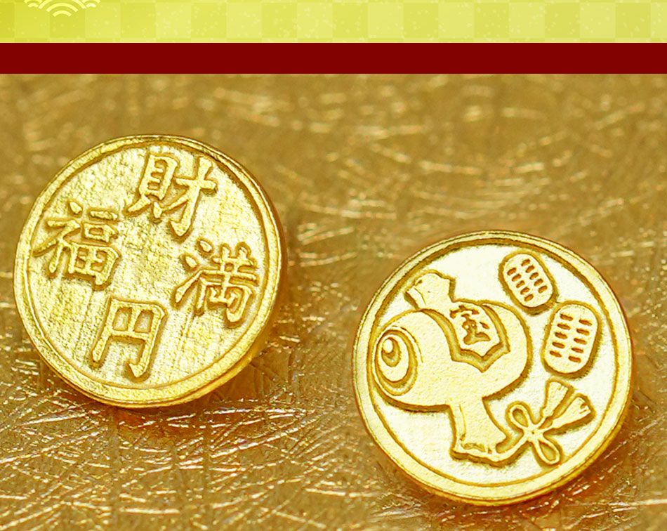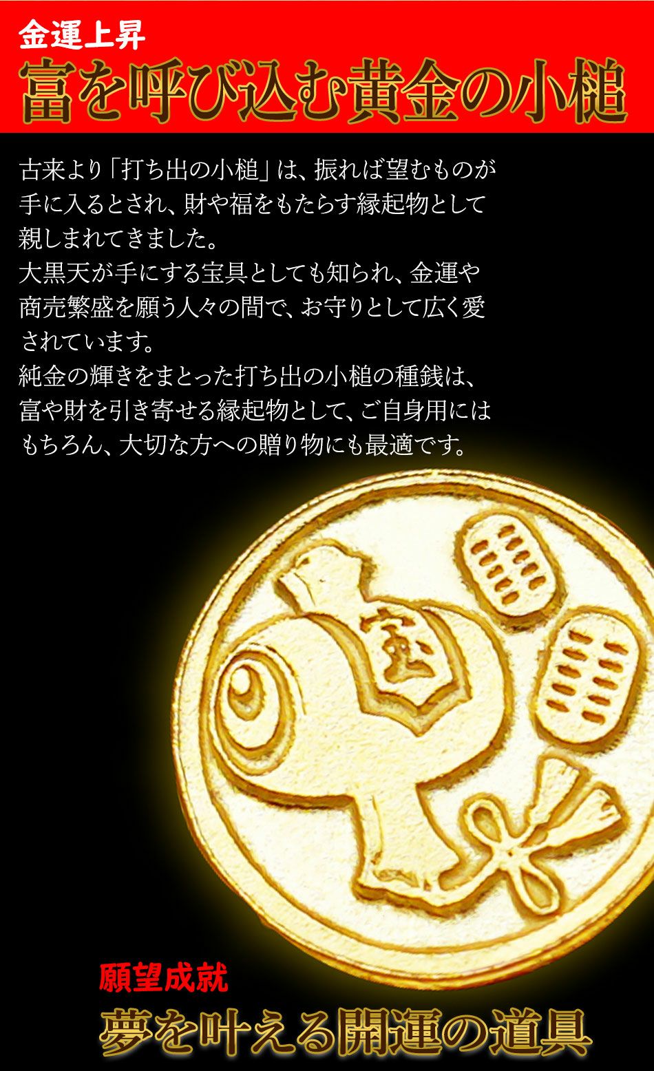 富や福を授ける神、大黒天様のの持ち物である打ち出の小槌をモチーフにした、金運アップの種銭です。 金運効果が高いといわれる純金に、どんな願いでも叶うとされる伝説の宝物の「打ち出の小槌」を描き、背面には富と福が調和し豊かな人生を願う「財福円満」の文字を刻んでいます。 永遠の豊かさを手にしたい方、円満な生活を望む方におすすめの種銭です。