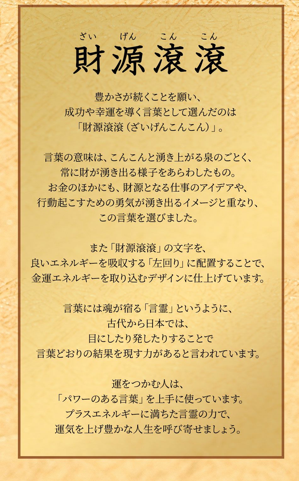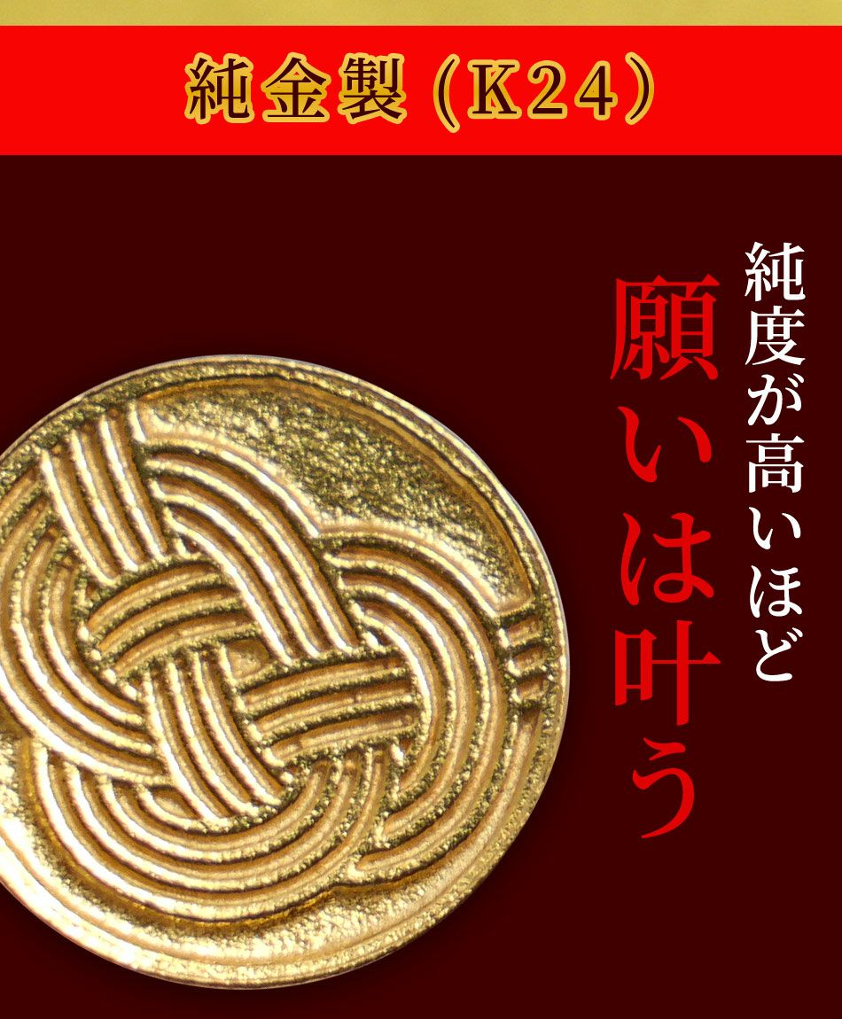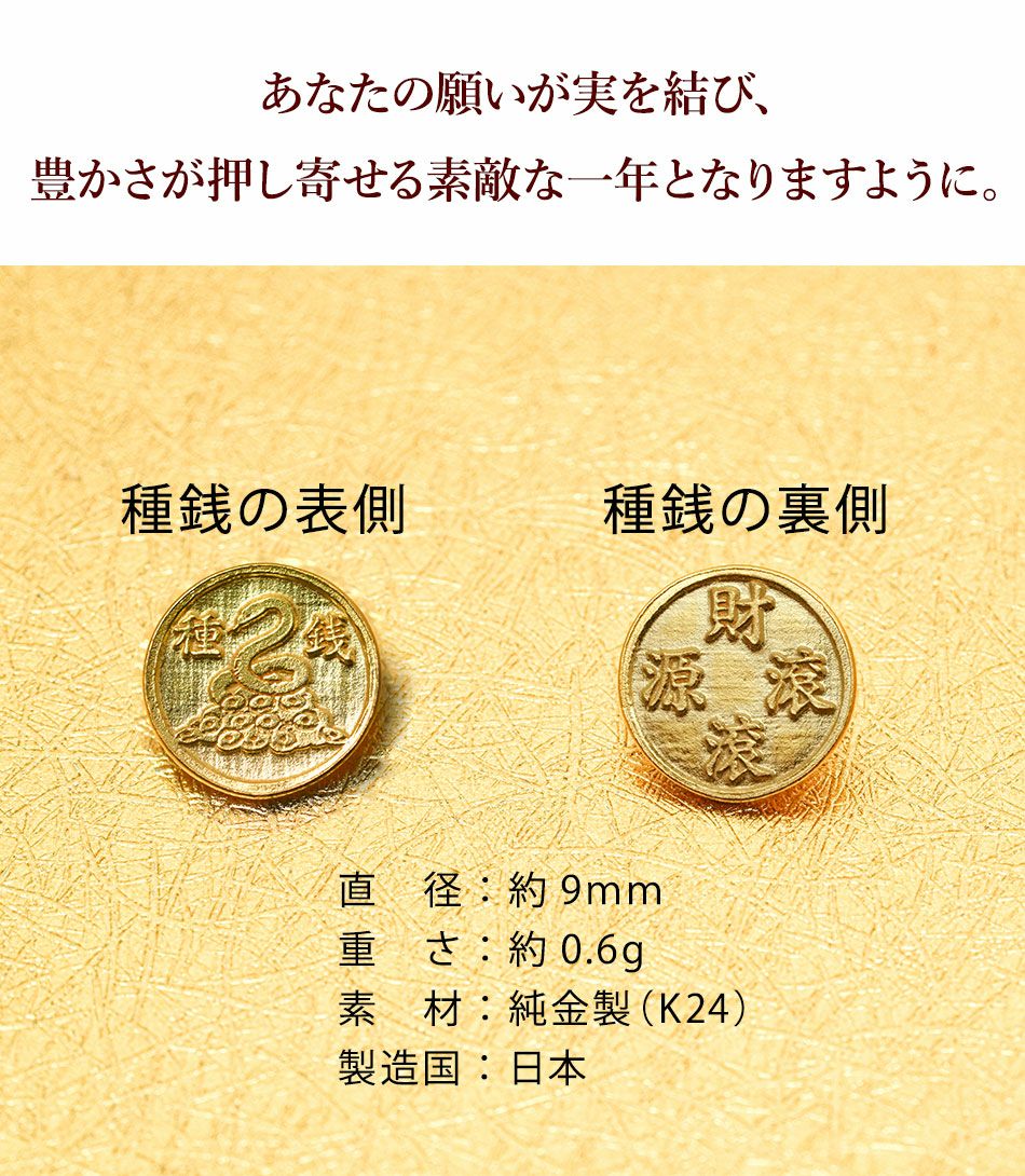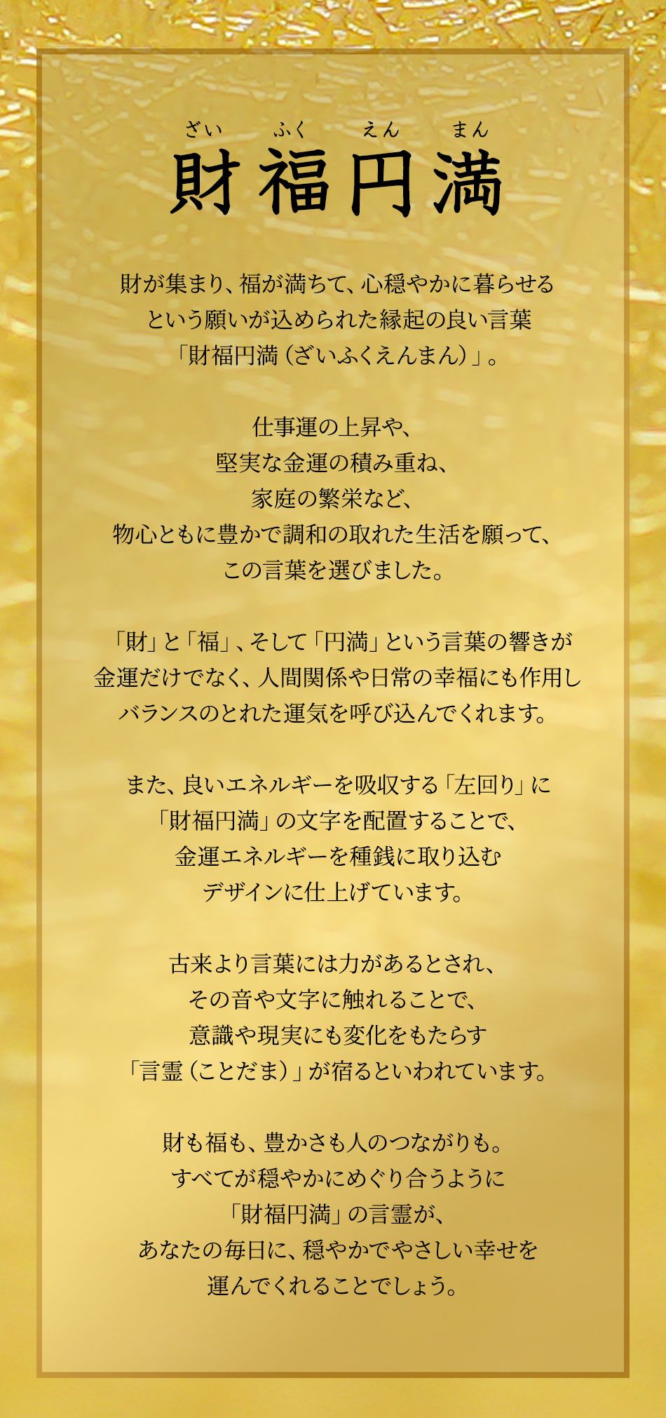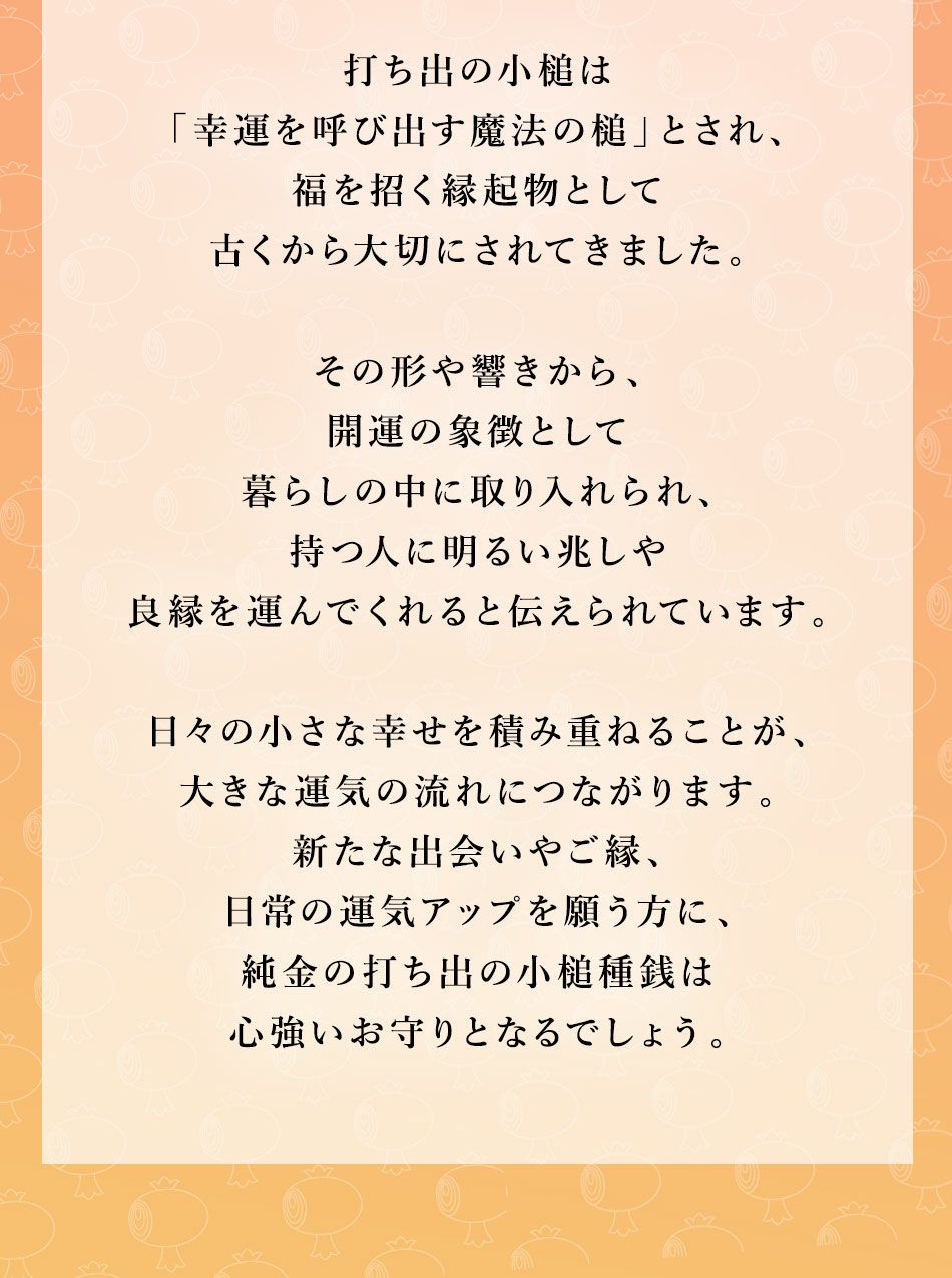 富や福を授ける神、大黒天様のの持ち物である打ち出の小槌をモチーフにした、金運アップの種銭です。 金運効果が高いといわれる純金に、どんな願いでも叶うとされる伝説の宝物の「打ち出の小槌」を描き、背面には富と福が調和し豊かな人生を願う「財福円満」の文字を刻んでいます。 永遠の豊かさを手にしたい方、円満な生活を望む方におすすめの種銭です。