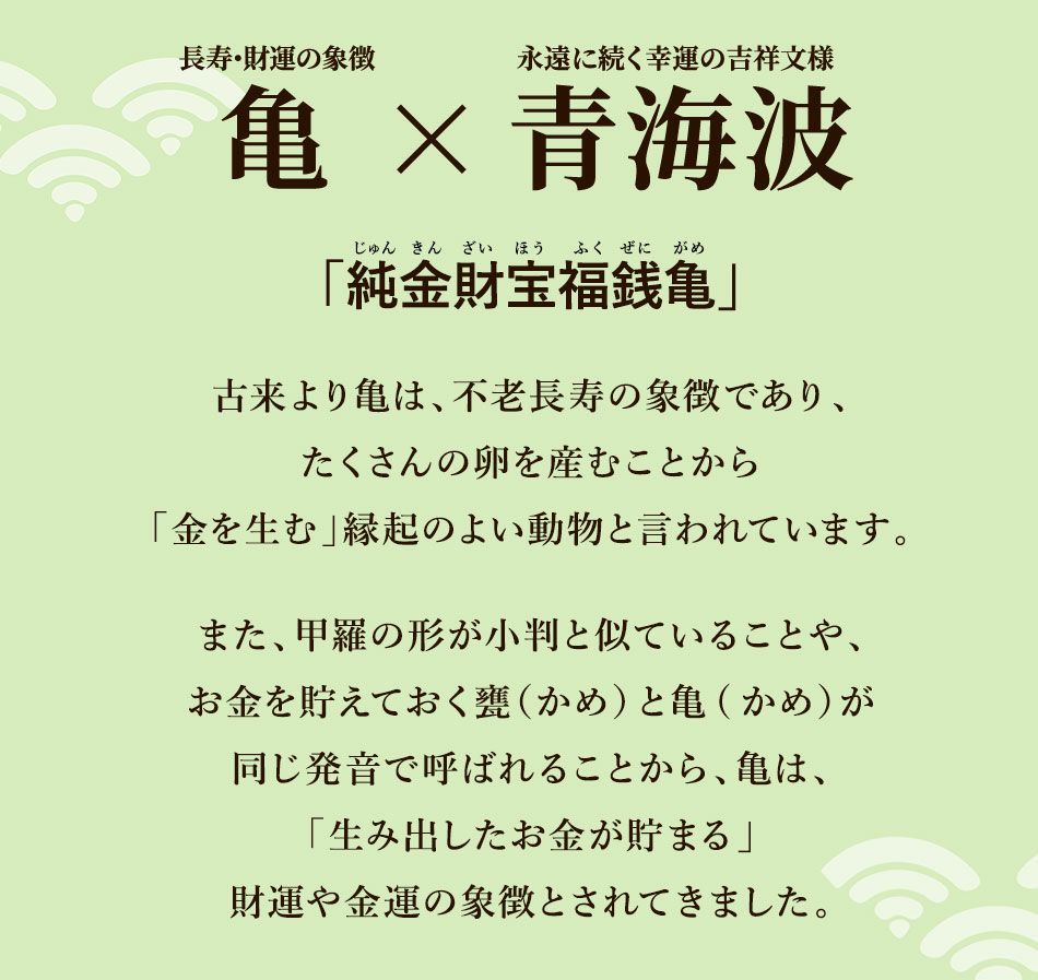亀の背景には、無限に広がる波を描いた、吉祥文様である「青海波」をあしらいました。